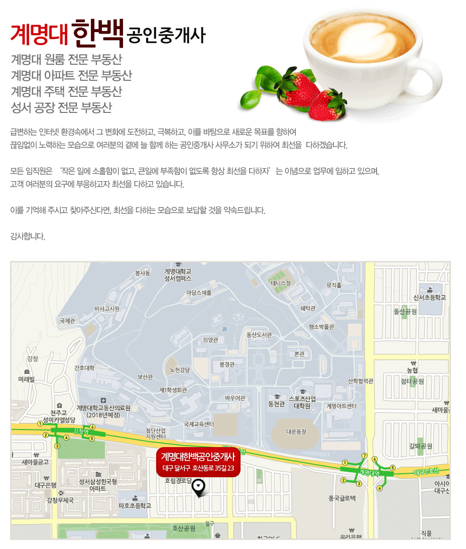 °è¸í´ëÇÑ¹é°øÀÎÁß°³»ç | [42708 ] ´ë±¸±¤¿ª½Ã ´Þ¼­±¸ È£»êµ¿·Î 35±æ 23 (È£»êµ¿379-9)